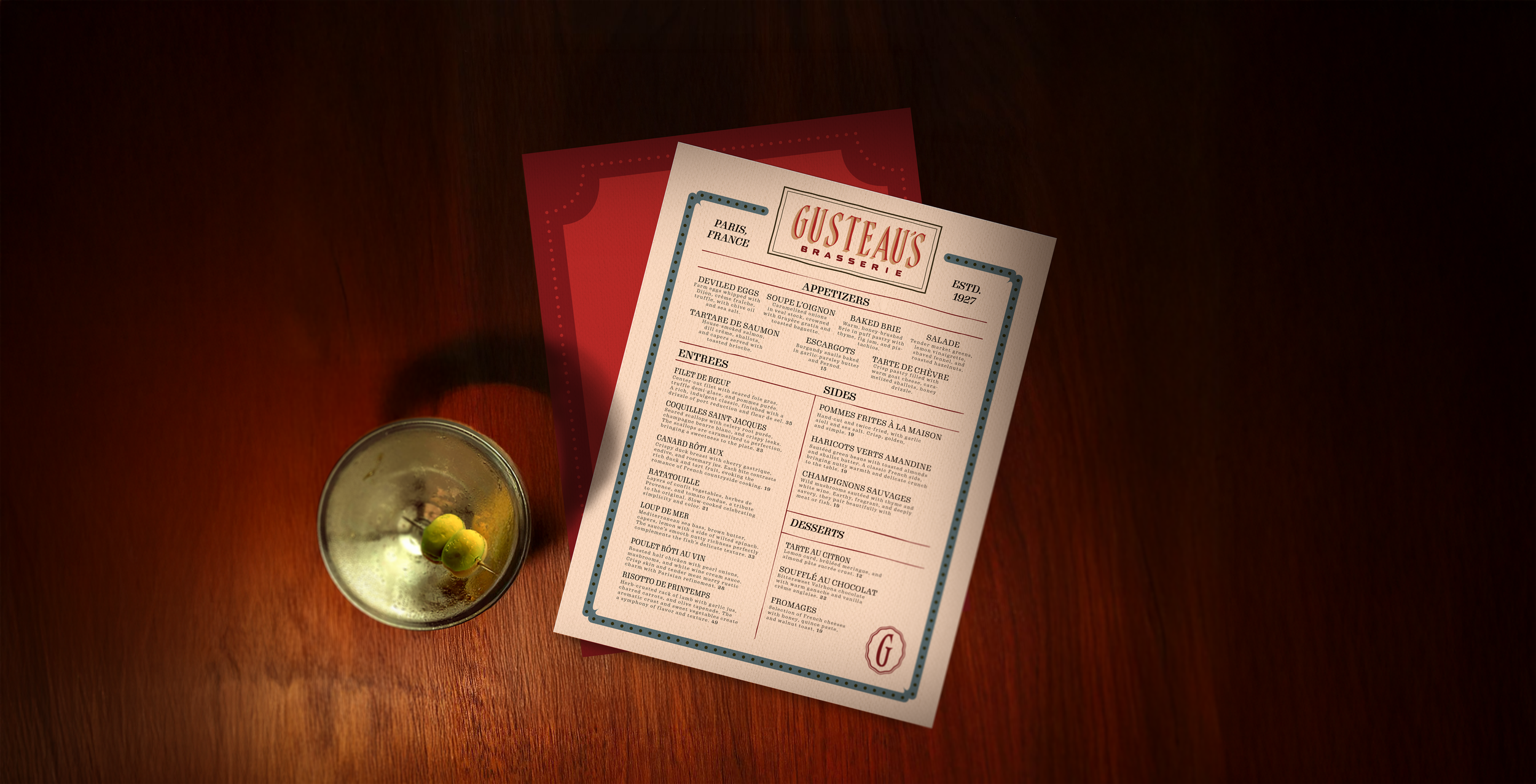 Gusteau’s French Brasserie is a hospitality brand concept inspired by the traditions of Parisian dining. The project explores how historical brasserie aesthetics like ornamented typography, framed compositions, and refined color palettes, can be translated into a cohesive, modern brand system. Spanning logo design, menus, packaging, and tableware applications, the identity balances warmth and sophistication while maintaining a timeless, established presence.