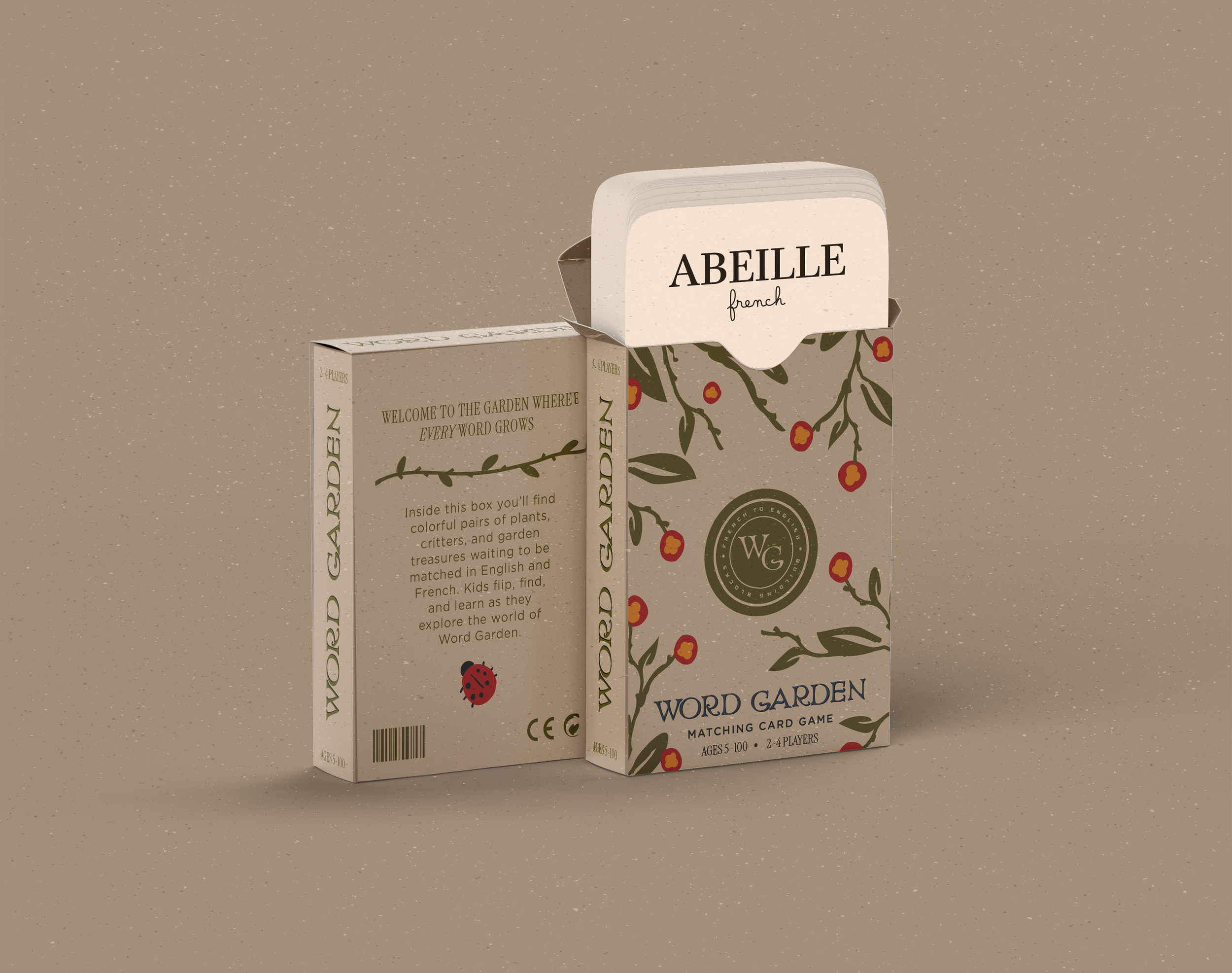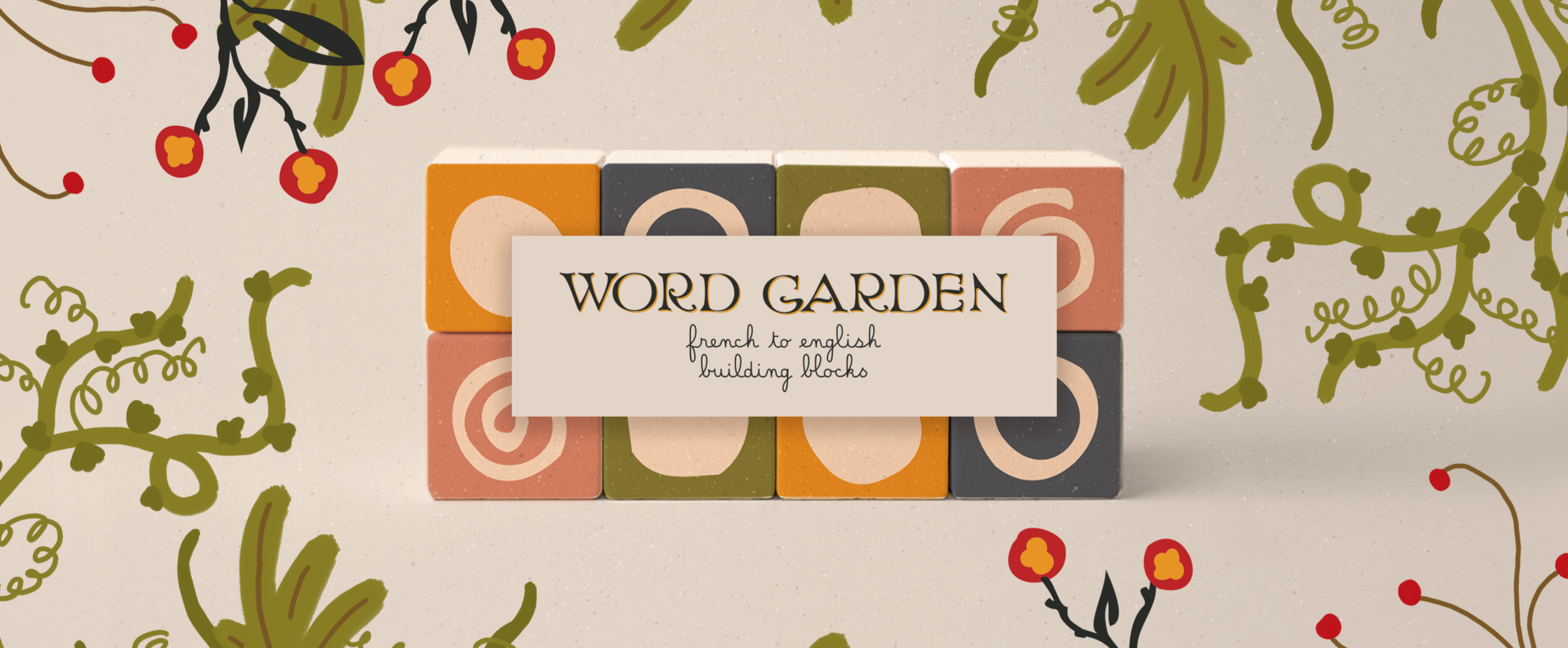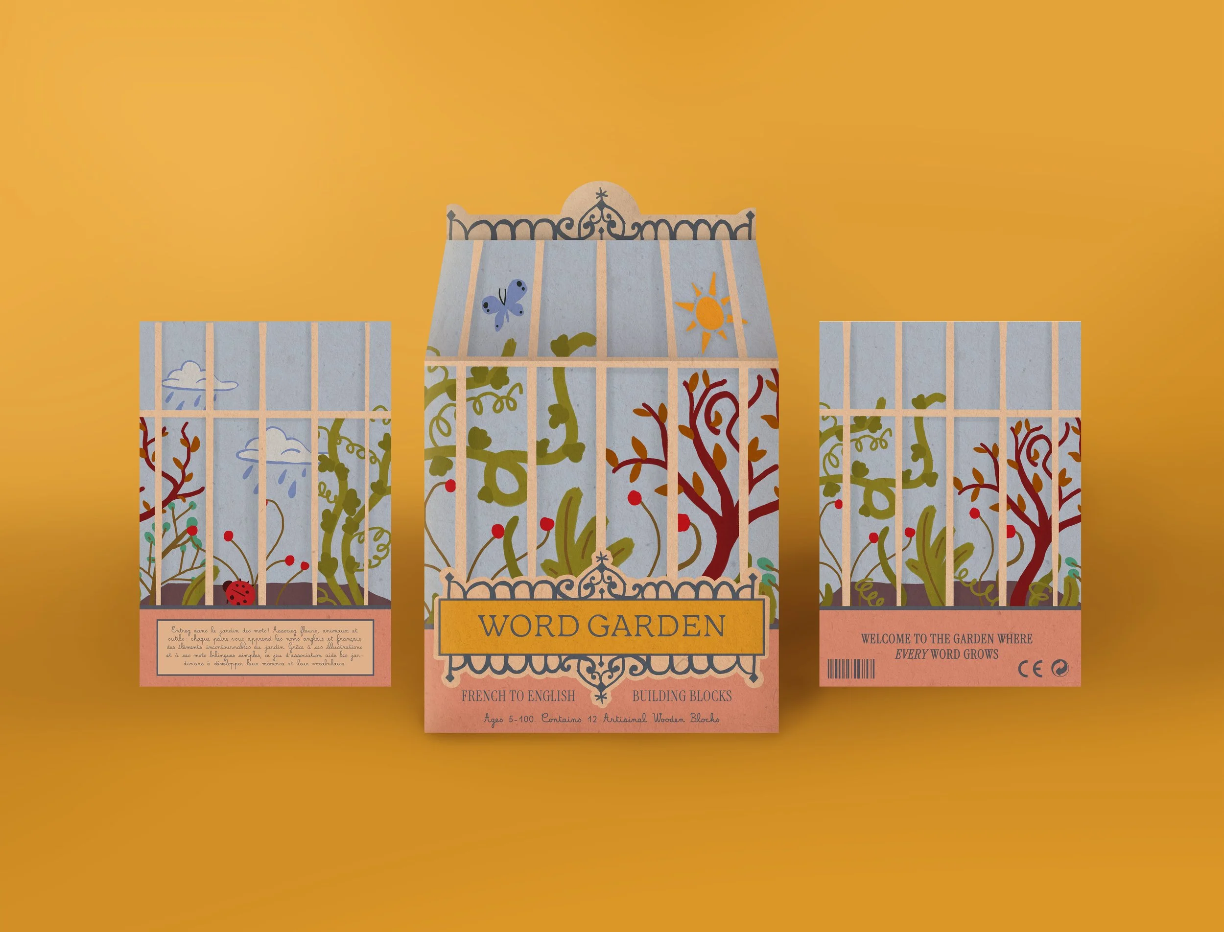 Word Garden is a bilingual, garden-themed language learning toy designed to introduce young learners to French and English vocabulary through play. The project consists of a set of illustrated building blocks paired with a matching card game, encouraging exploration, pattern recognition, and early language development. By combining tactile interaction with a warm, storybook-inspired visual system, Word Garden transforms vocabulary learning into a playful, approachable experience.