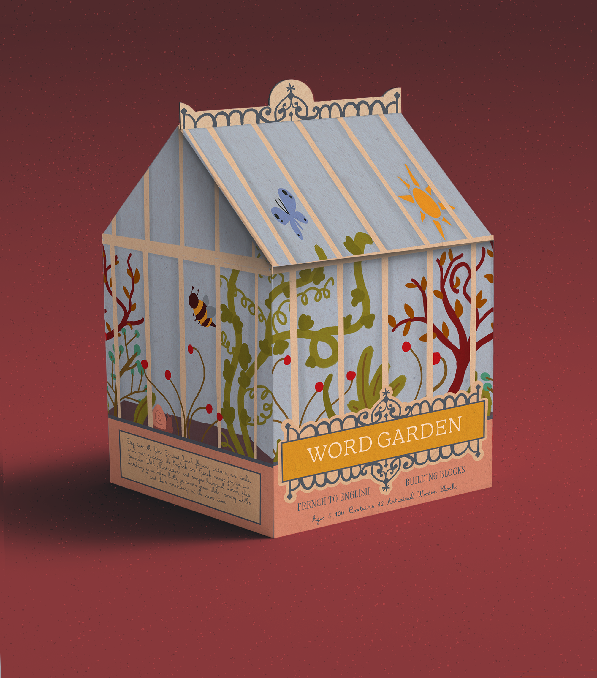 Rather than using a standard box, Word Garden is housed in a greenhouse-inspired package that reinforces the narrative of growth and learning. Cut-out details, illustrated foliage, and layered surfaces create a sense of discovery while visually connecting the packaging to the product inside. The structure serves both as protection and as an extension of the play experience.